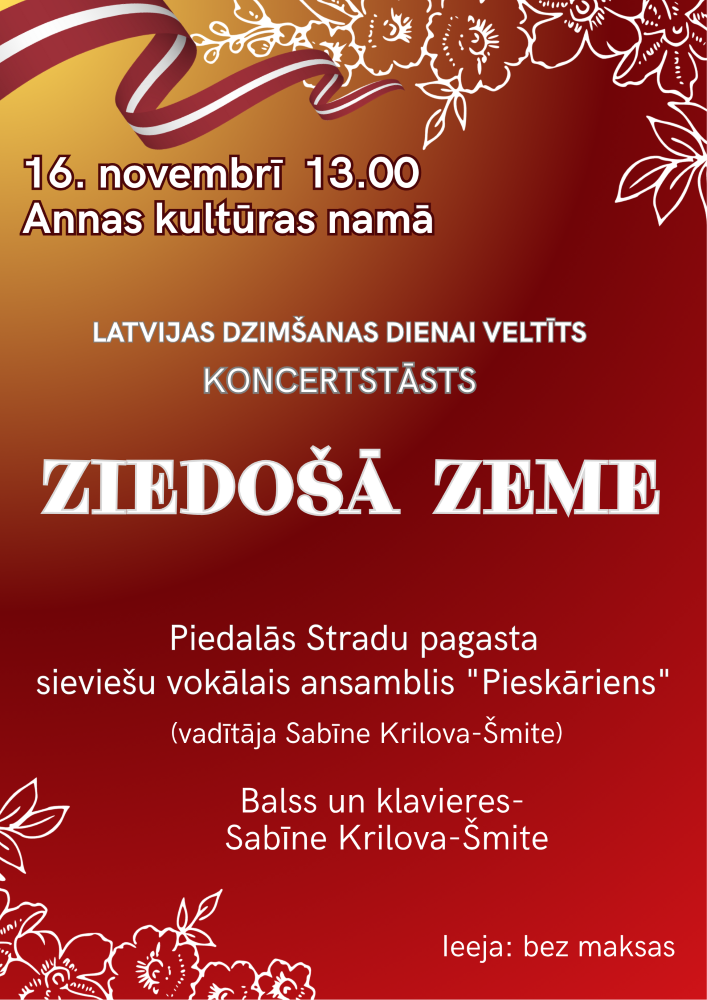 Annas kultūras namā Latvijas dzimšanas dienai veltīts koncertstāsts “Ziedošā zeme” - ielūdz Stradu pagasta sieviešu vokālais ansamblis “Pieskāriens” (vadītāja Sabīne Krilova-Šmite), balss un klavieres - Sabīne Krilova-Šmite.