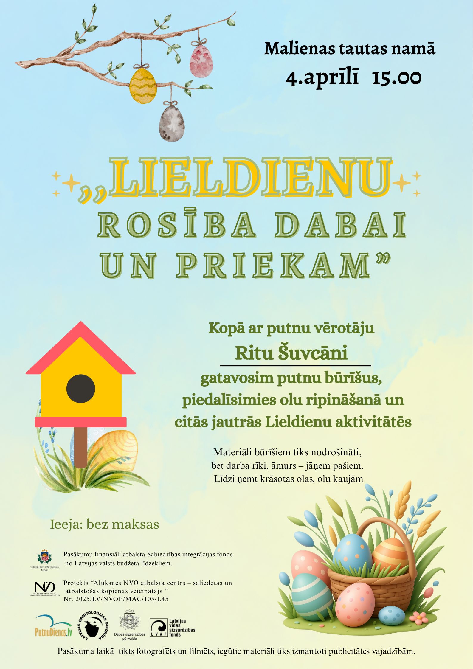 Malienas tautas namā pasākums ģimenēm “Lieldienu rosība dabai un priekam”. Kopā ar putnu vērotāju Ritu Šuvcāni gatavosim putnu būrīšus, piedalīsimies olu ripināšanā un baudīsim citas jautras Lieldienu aktivitātes. Materiāli būrīšiem […]