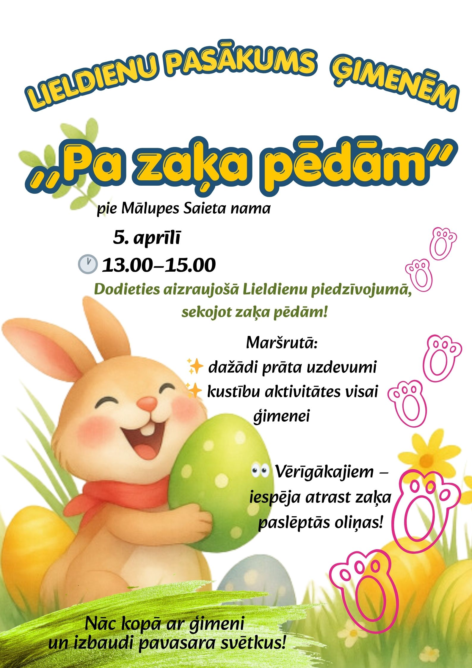 Pie Mālupes Saieta nama aktivitātes ģimenēm “Pa zaķa pēdām”. Sekojot zaķa pēdām, dalībnieki dodas Lieldienu piedzīvojumā, kur maršrutā jāveic dažādi prāta un kustību uzdevumi. Vērīgākajiem būs iespēja atrast arī zaķa […]