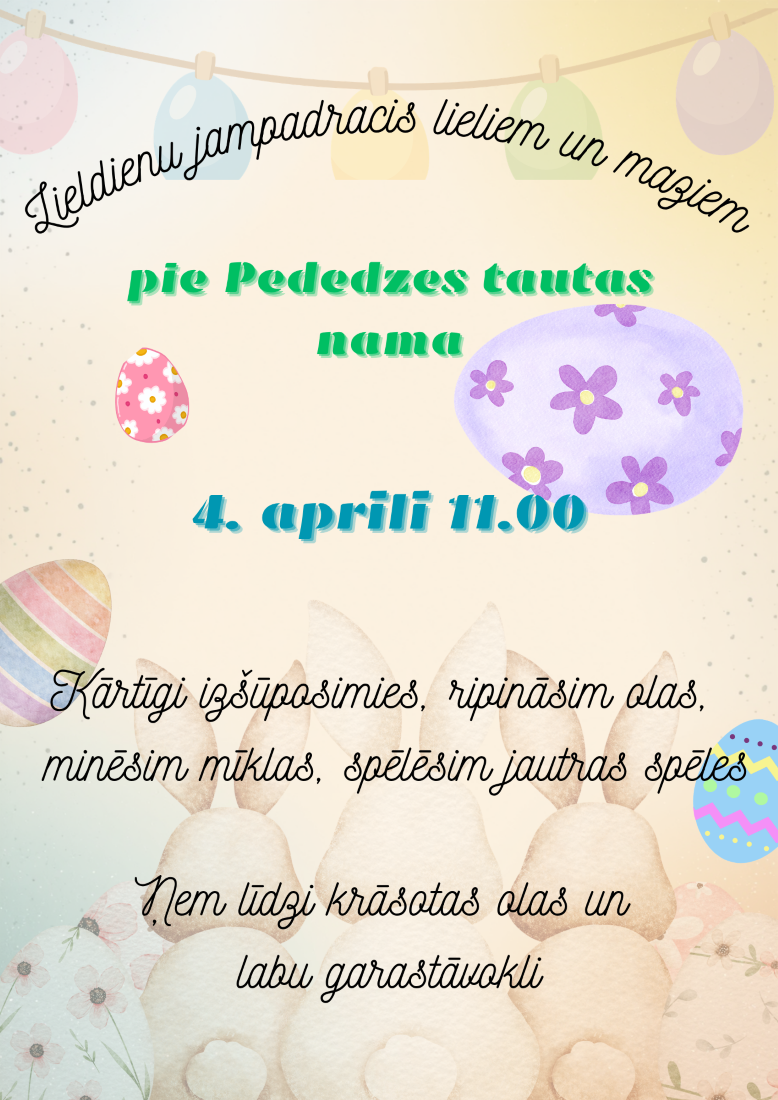Pie Pededzes tautas nama Lieldienu jampadracis lieliem un maziem. Kārtīgi izšūposimies, ripināsim olas, minēsim mīklas, spēlēsim jautras spēles. Ņem līdzi krāsotas olas un labu garastāvokli.