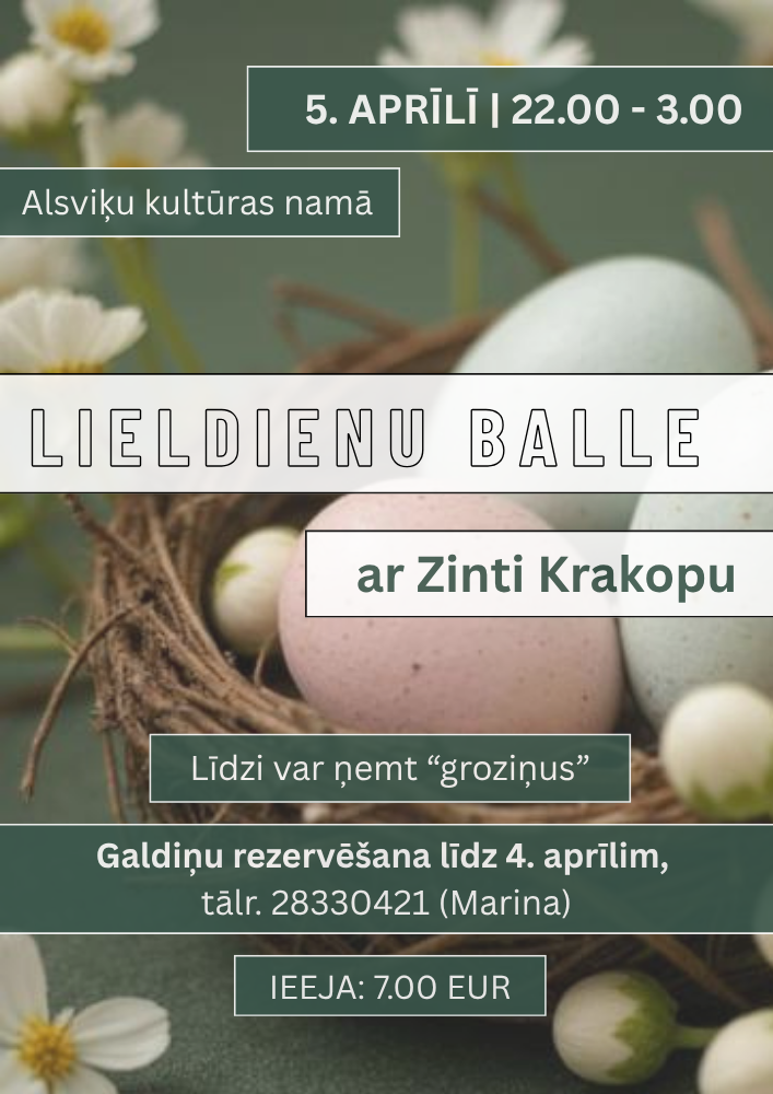 Lieldienu balle ar Zinti Krakopu. Līdzi var ņemt “groziņus”. Galdiņu rezervēšana līdz 4. aprīlim, tālr. 28330421 (Marina).