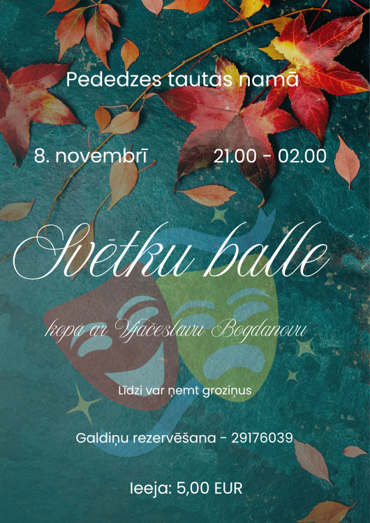 Pededzes tautas namā svētku balle. Spēlē Vjačeslavs Bogdanovs. Līdzi var ņemt “groziņu”. Galdiņu rezervēšana pa tālruni 29176039.