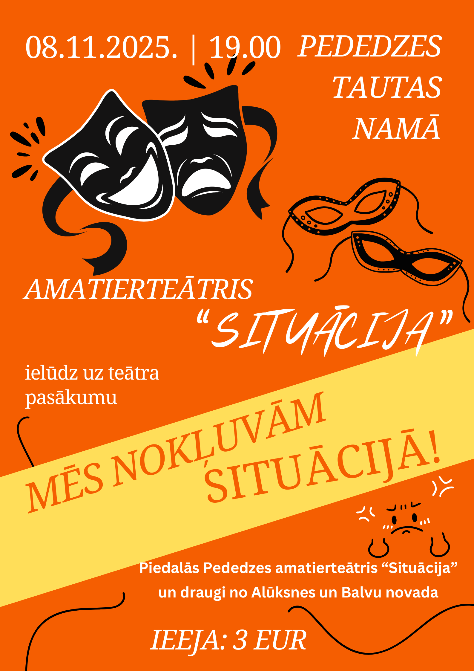 Amatierteātris “Situācija” ielūdz uz teātra pasākumu “Mēs nokļuvām “Situācijā””. Piedalās Pededzes amatierteātris un draugi no Alūksnes un Balvu novada.