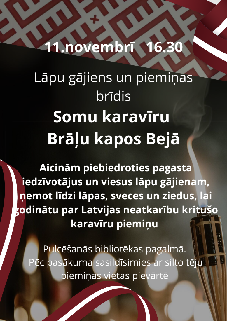Lāpu gājiens un piemiņas brīdis Somu karavīru Brāļu kapos Bejā. Aicināti pievienoties Jaunalūksnes pagasta iedzīvotāji un viesi. Pulcēšanās bibliotēkas pagalmā, ņemot līdzi lāpas, sveces un ziedus, lai godinātu par Latvijas neatkarību kritušo karavīru piemiņu. Pēc gājiena varēs sasildīties ar tējas tasi. |