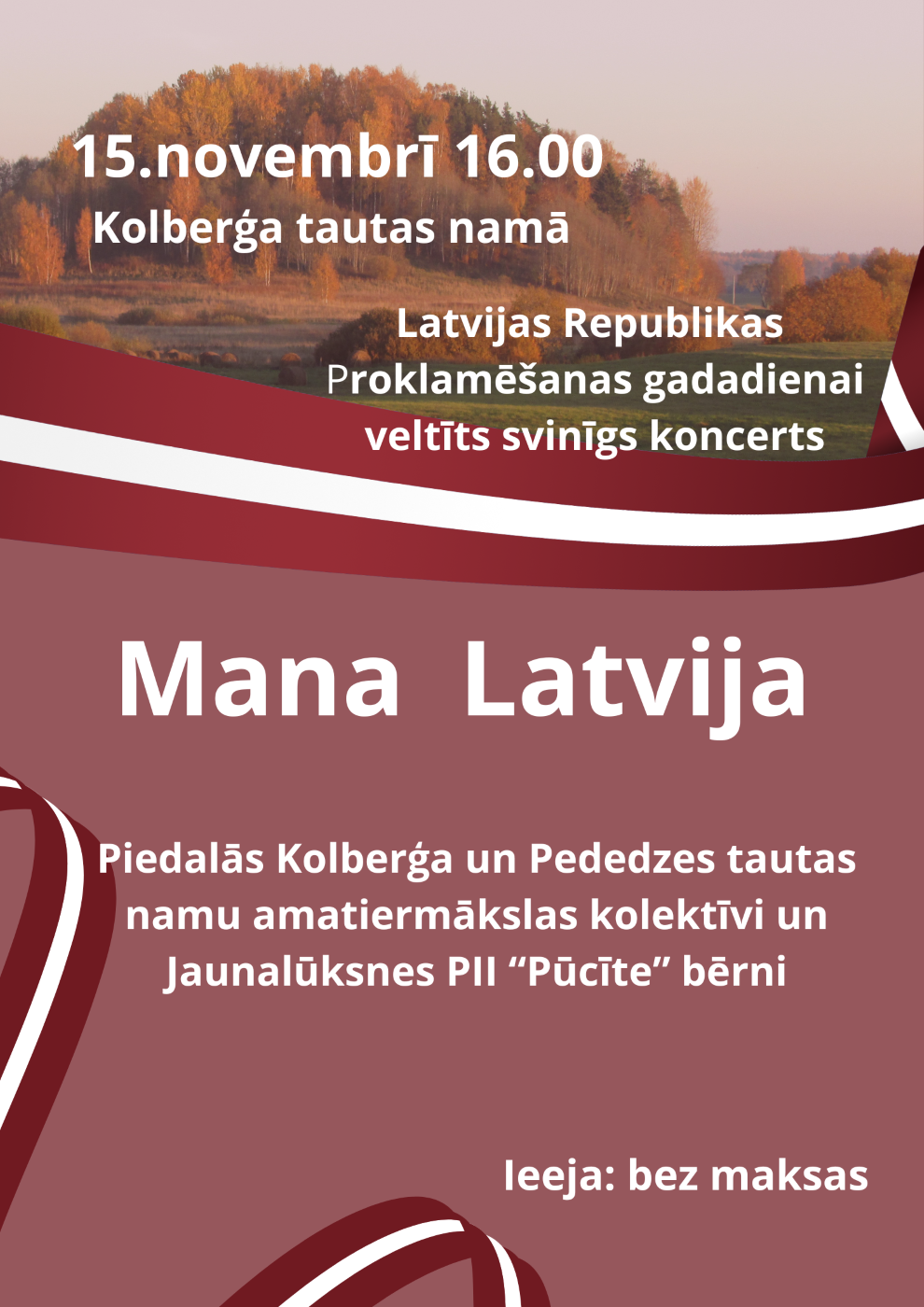 Kolberģa tautas namā Latvijas Republikas Proklamēšanas gadadienai veltīts svinīgs koncerts “Mana Latvija”. Piedalās Kolberģa un Pededzes tautas namu amatiermākslas kolektīvi un pirmsskolas izglītības iestādes audzēkņi.