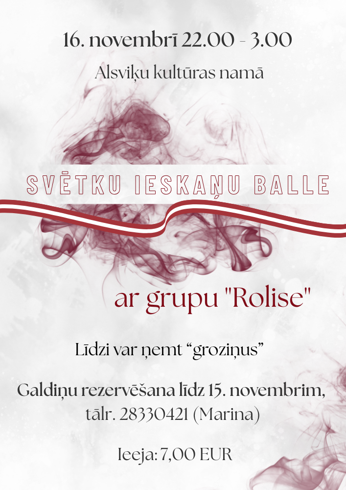 Alsviķu kultūras namā svētku ieskaņu balle ar grupu “Rolise”. Līdzi var ņemt “groziņus”. Galdiņu rezervēšana līdz 15. novembrim pa tālruni 28330421 (Marina).