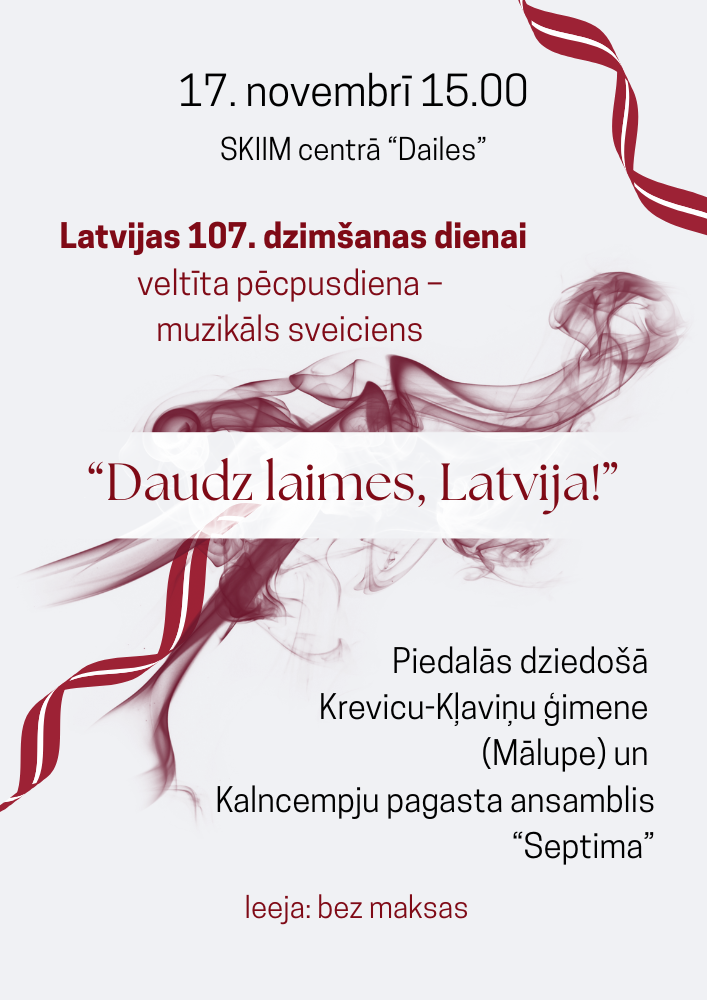 Latvijas 107. dzimšanas dienai veltīta pēcpusdiena – muzikāls sveiciens “Daudz laimes, Latvija!”. Piedalās dziedošā Krevicu - Kļaviņu ģimene (Mālupe) un Kalncempju pagasta ansamblis “Septima”.