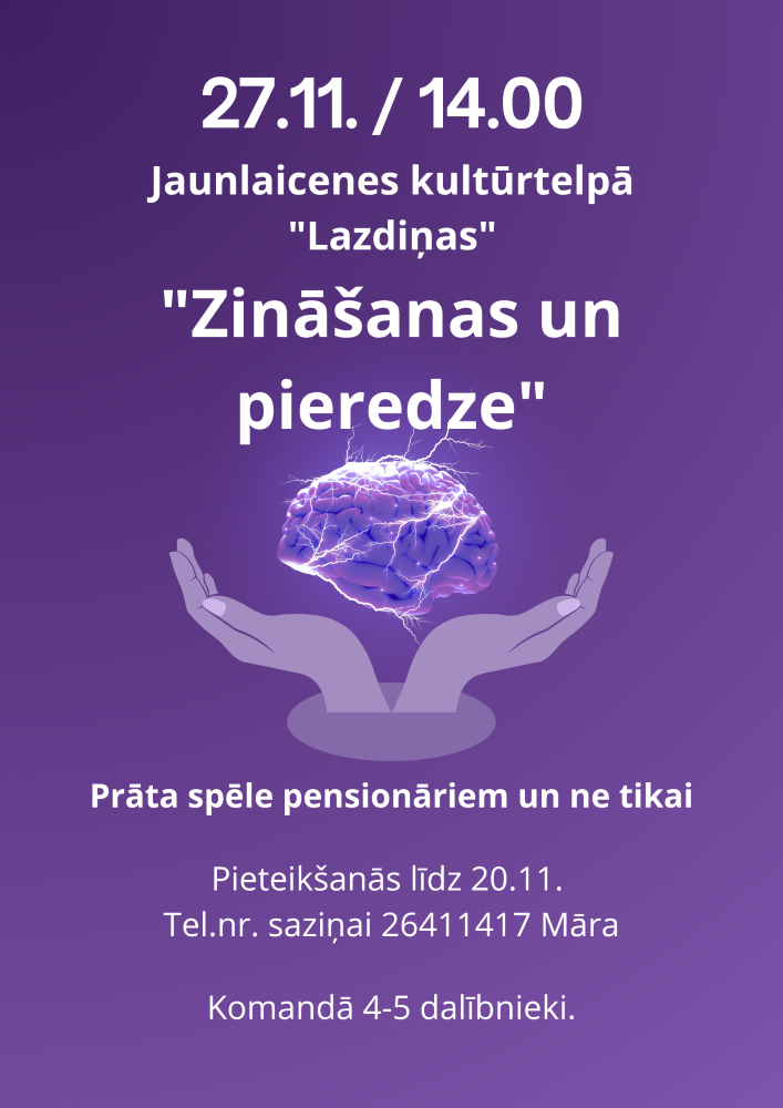 Erudīcijas spēle “Zināšanas un pieredze”. Jaunlaicenes pagasta pensionāru kopa “Pūrs” organizē un aicina novada seniorus atsaukties un piedalīties spēlē. Spēlē būs iespēja uzzināt, dalīties ar zināšanām tādās jomās kā daba, personības, valoda, mūzika u. c. Latvijā. Trīs veiksmīgākās komandas tiks pie pārsteiguma balvām. Komandā 4-5 dalībnieki. Par dalību paziņot līdz 20. novembrim. Sīkāka informācija un pieteikšanās pa tālruni 26411417 (Māra).