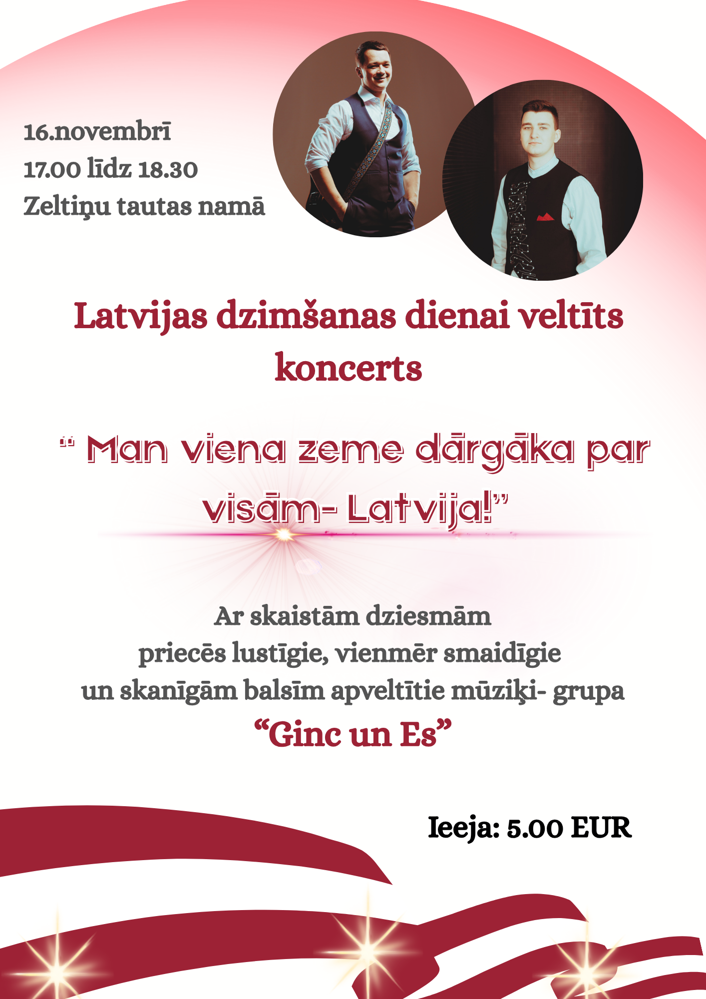 Zeltiņu tautas namā Latvijas dzimšanas dienai veltīts koncerts “Man viena zeme dārgāka par visām – Latvija!”. Ar skaistām dziesmām priecēs lustīgie, vienmēr smaidīgie un skanīgām balsīm apveltītie mūziķi – grupa “Ginc un Es”.