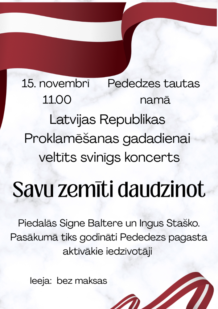 Pededzes tautas namā Latvijas Republikas Proklamēšanas gadadienai veltīts svinīgs koncerts “Savu zemīti daudzinot”. Piedalās Signe Baltere un Ingus Staško. Pasākumā tiks godināti Pededzes pagasta aktīvākie iedzīvotāji.