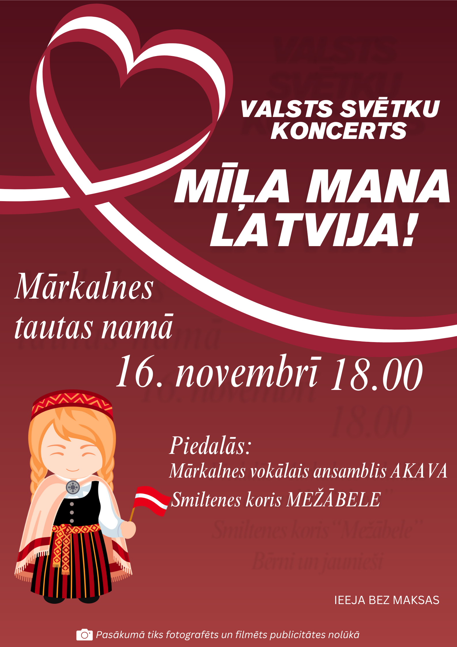 Mārkalnes tautas namā Valsts svētku koncerts “Mīļa mana Latvija”. Piedalās Mārkalnes vokālais ansamblis “Akava”, Smiltenes koris “Mežābele”.